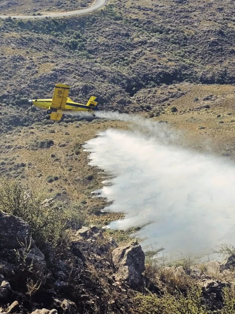 El operativo aéreo se mantiene con seis aviones hidrantes —cuatro pertenecientes a la Provincia y dos al Sistema Federal— y tres helicópteros, dos del Sistema Federal y uno provincial, que realizan descargas en los sectores de difícil acceso.