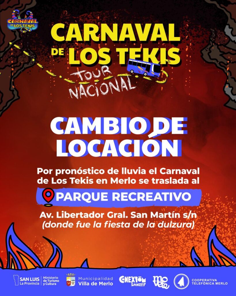 La organización del “Carnaval de Los Tekis” informó un cambio de locación para el evento previsto este sábado 4 de abril en la Villa de Merlo, debido al pronóstico de inestabilidad climática.