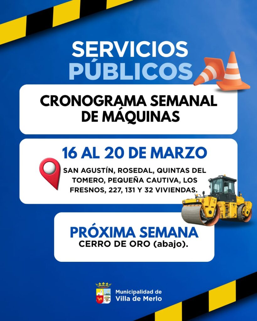 El Municipio de la Villa de Merlo dio a conocer el cronograma semanal de trabajo del área de Servicios Públicos, en el marco de las tareas de mantenimiento y mejora que se desarrollan en distintos sectores de la ciudad.