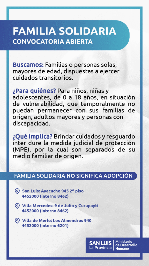 El Ministerio de Desarrollo Humano mantiene abierta la convocatoria para el registro de Familias Solidarias, una iniciativa que brinda contención y cuidado temporario a niños, niñas, adolescentes, adultos mayores y personas con discapacidad cuyos derechos se encuentran vulnerados.
