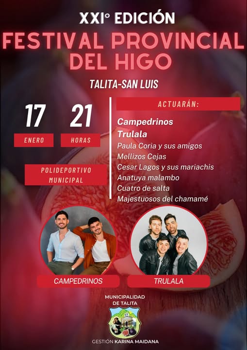 En Talita, desde las 21:00 en el Polideportivo Municipal, se celebrará la 21ª edición del Festival Provincial del Higo, un evento que año a año suma convocatoria. La grilla artística incluye a Paula y sus Amigos, Los Mellizos Cejas, Carlos Lagos y sus Mariachis, Añatuya Malambo, Los Majestuosos del Chamamé, Los 4 de Salta y Campedrinos, con el gran cierre bailable a cargo de Trulalá. El predio contará con servicio de cantina y comidas criollas, y el público podrá llevar reposeras. La entrada tendrá un valor de $15.000 y se podrá adquirir en el ingreso.