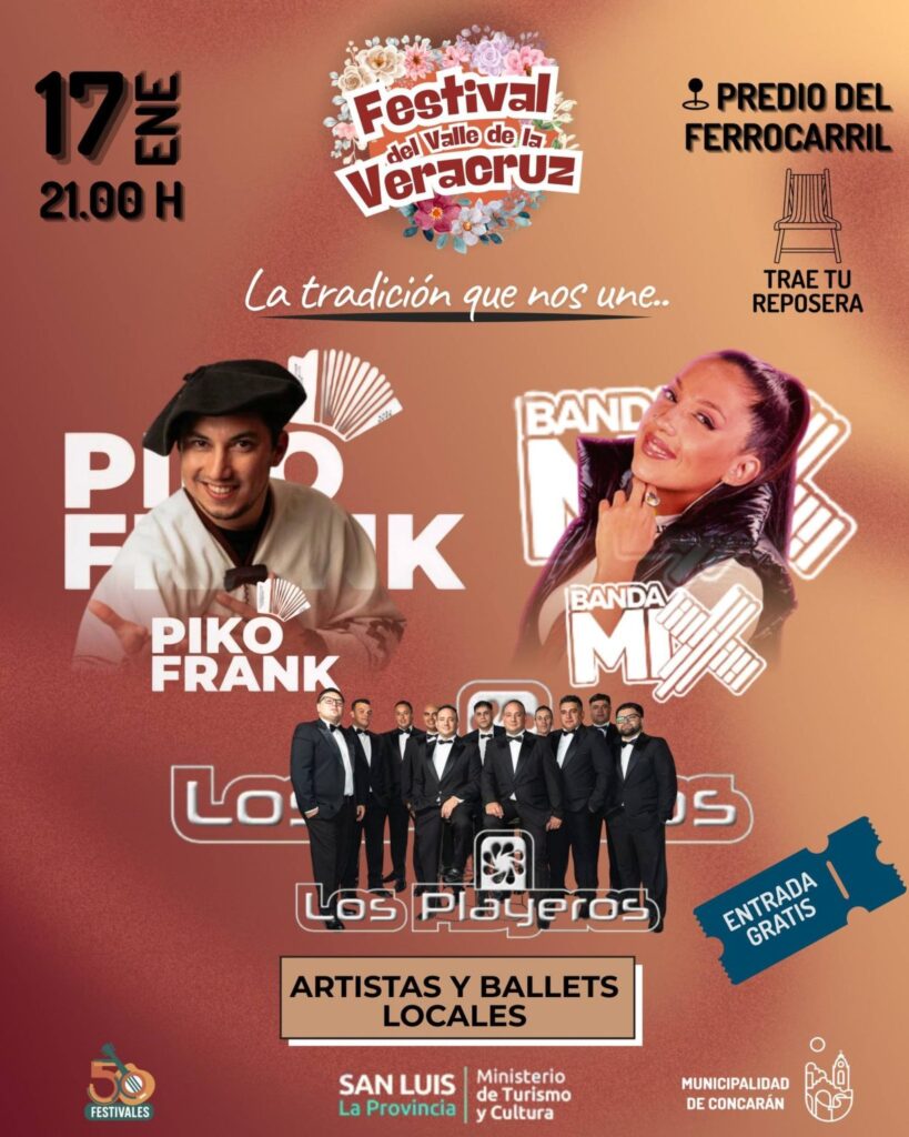 En Concarán, a partir de las 21:00, el predio del ferrocarril será escenario del Festival del Valle de la Veracruz, con la presencia de Piko Frank, Banda Mix y Los Playeros, junto a artistas y ballets locales. La entrada será libre y gratuita, y se permitirá el ingreso con reposeras y equipos de mate, aunque no con bebidas ni comidas.