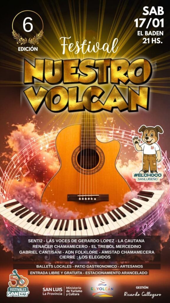 Por su parte, El Volcán celebrará desde las 21:30 una nueva edición del festival “Nuestro Volcán” en el balneario El Badén. Sobre el escenario se presentarán Amistad Chamamecera, Los Chicos de El Volcán, el ballet de la profe Mari, Guardia Gaucha, Gerardo López, El Trébol Mercedino, La Cautana, ADN Folclore, el dúo Chirino con Merino y el cierre a puro ritmo de Los Elegidos. Además, habrá ballets locales, patio gastronómico y artesanos. La entrada será libre y gratuita, con estacionamiento arancelado.