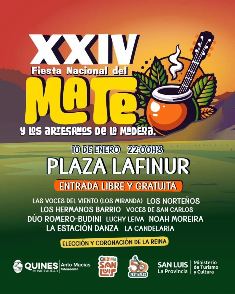 El sábado por la noche, desde las 22:00, la plaza Lafinur será el escenario de la 24° edición de la Fiesta Nacional del Mate y los Artesanos de la Madera. Con entrada libre y gratuita, el festival rendirá homenaje a los productores y artesanos de la región.