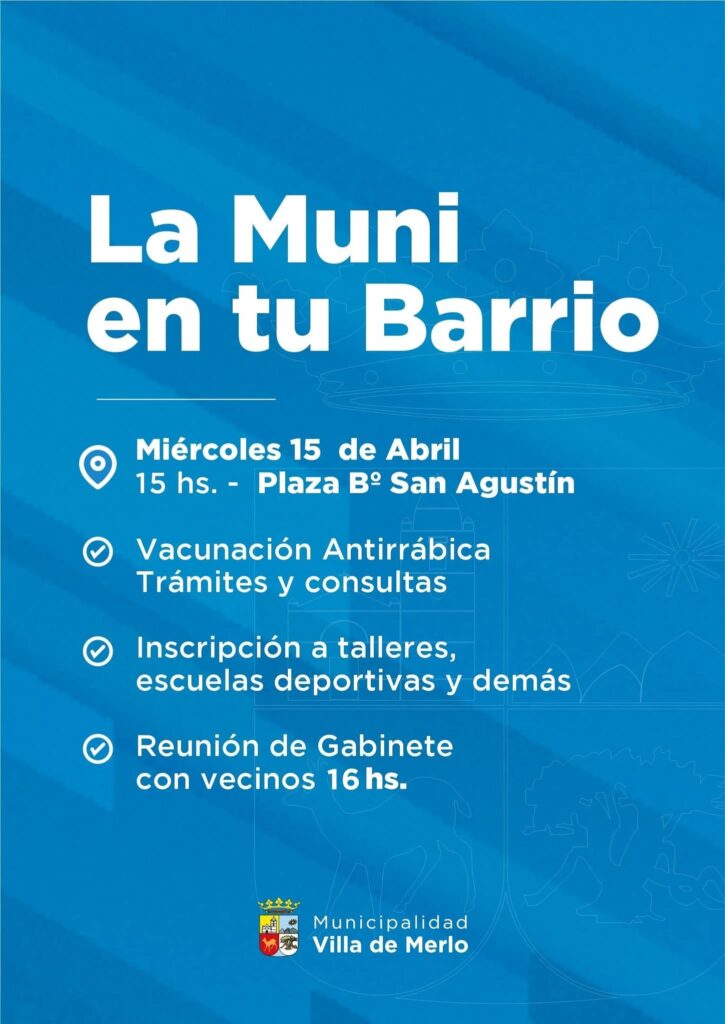 La Municipalidad de la Villa de Merlo realizará este miércoles 15 de abril, desde las 15:00, una nueva jornada de “La Muni en tu Barrio” en la plaza del barrio San Agustín, con una amplia propuesta de servicios, trámites y actividades abiertas a toda la comunidad.