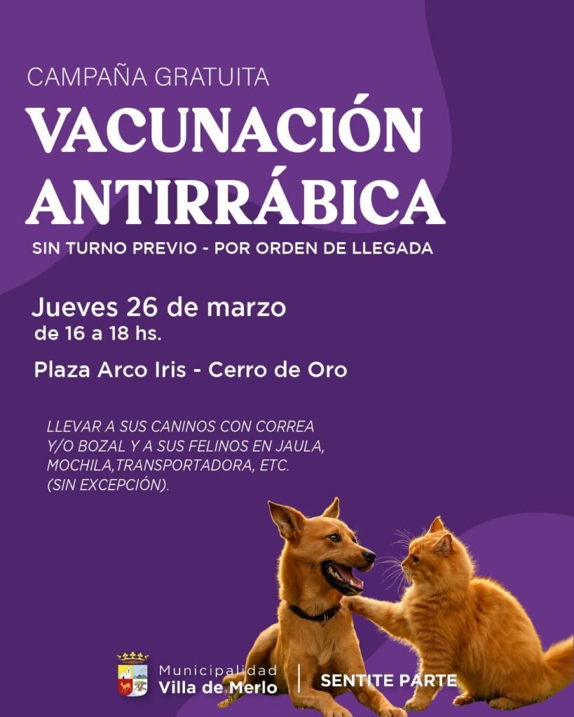En el marco del programa municipal “La Muni en tu Barrio”, este jueves 26 de marzo se llevará a cabo una nueva jornada de vacunación antirrábica gratuita en la Villa de Merlo.