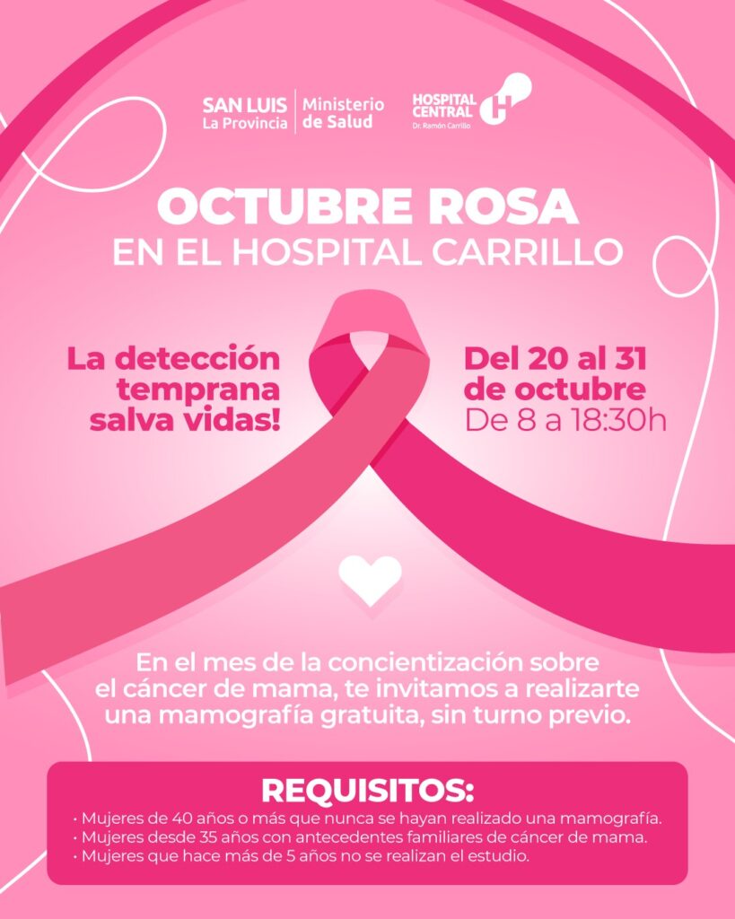 En el marco del mes de concientización y prevención del cáncer de mama, el sistema público de salud provincial, a través del Hospital Central “Dr. Ramón Carrillo”, lleva adelante una campaña de mamografías gratuitas y sin turno previo.