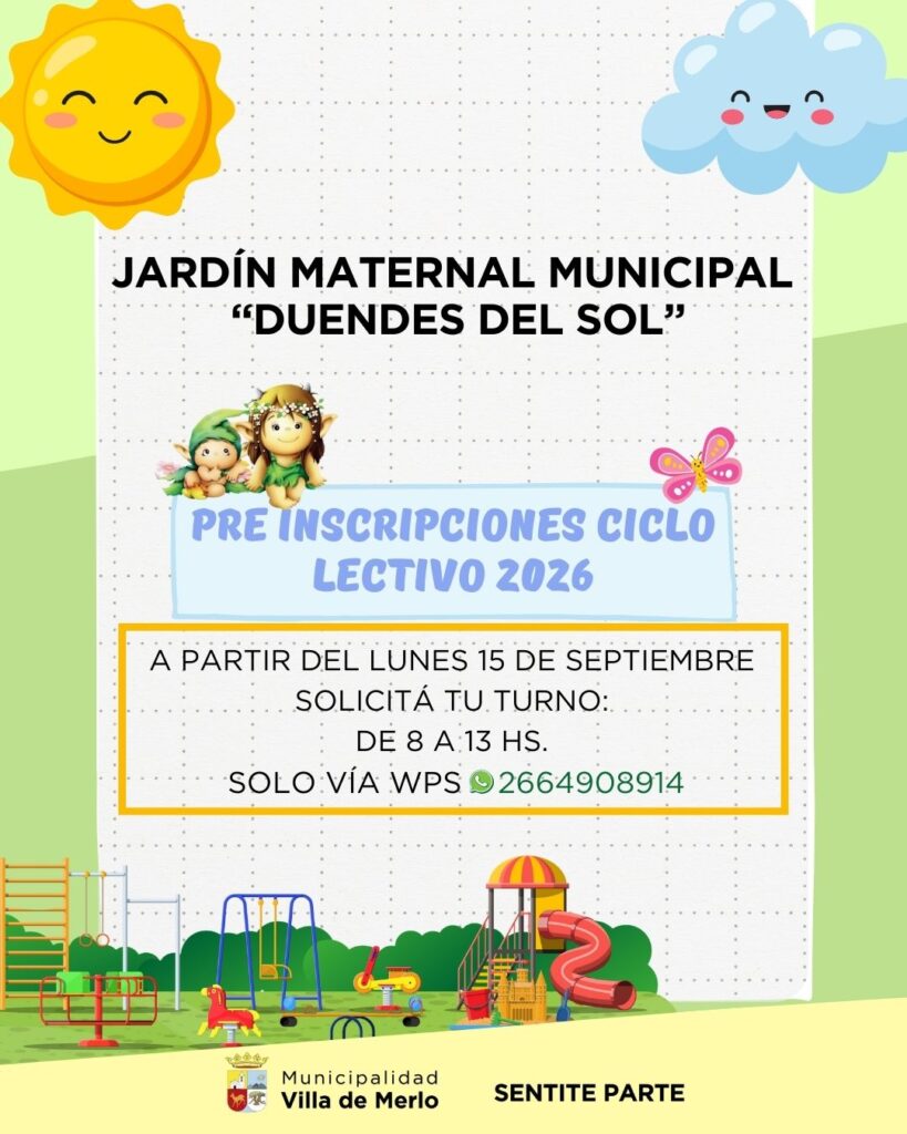 La Municipalidad de la Villa de Merlo informó que, a partir del 15 de septiembre, se podrán solicitar los turnos previos obligatorios para la preinscripción del ciclo lectivo 2026 en el Jardín Maternal Municipal “Duendes del Sol”.