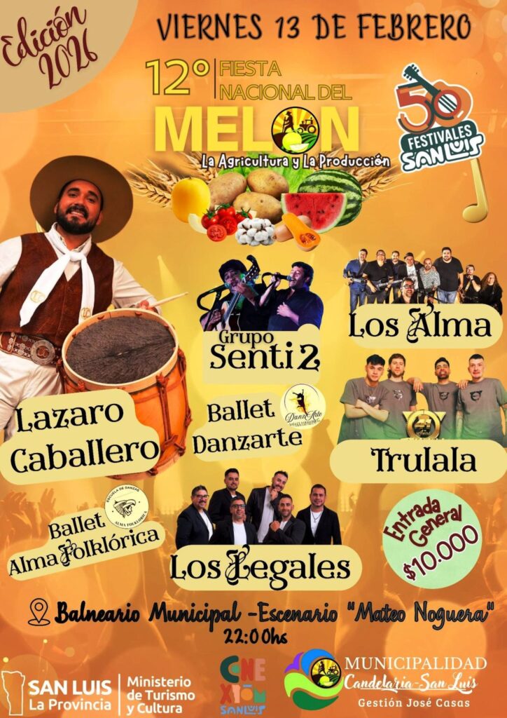 Candelaria se prepara para vivir una de las celebraciones más importantes de su calendario cultural con la llegada de la 12° Fiesta Nacional del Melón, la Agricultura y la Producción, que se desarrollará los días 8, 13 y 14 de febrero. El evento reunirá a artistas de reconocimiento nacional y provincial y convocará a vecinos y visitantes de distintos puntos de San Luis y provincias vecinas.