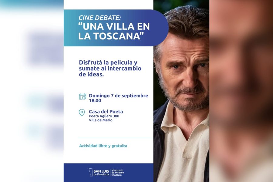 Finalmente, el domingo 7 a las 18:00, se proyectará la película “Una villa en la Toscana” (Reino Unido, 2020), protagonizada por Liam Neeson y apta para mayores de 13 años. Tras la función, integrantes de la Asociación Civil “La Ventana” impulsarán el debate de la cinta, con la conducción de Odelza Vega. La entrada será libre y gratuita.