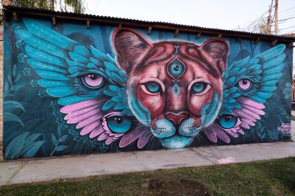 ‘La magia de lo invisible’ fue pintado en las esquinas de Milone y Perinetti, en el barrio Sol Naciente de Villa Mercedes. La pieza presenta el rostro de un felino con tres ojos y una mirada intensa, rodeado de alas que también contienen ojos. Predominan los tonos verdes, marrones y violetas, que refuerzan el clima místico de la composición.