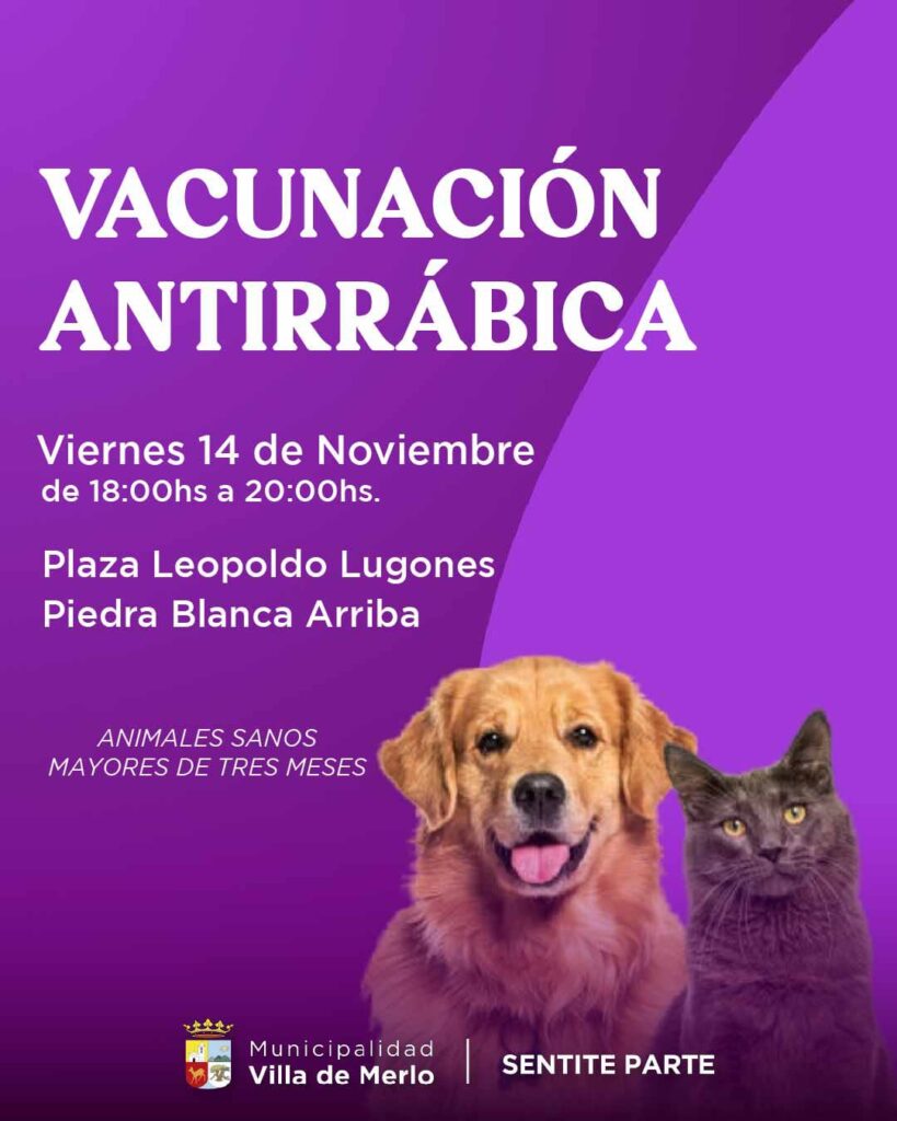 La Municipalidad de la Villa de Merlo informó que este viernes 14 de noviembre se realizará una nueva jornada de vacunación antirrábica gratuita destinada a perros y gatos. La actividad tendrá lugar en la Plaza Leopoldo Lugones, en Piedra Blanca Arriba, de 18:00 a 20:00.