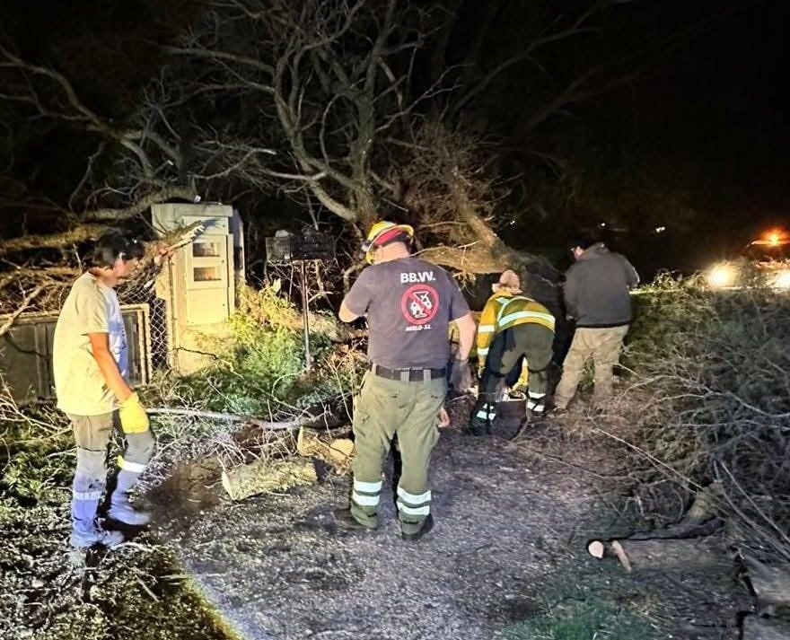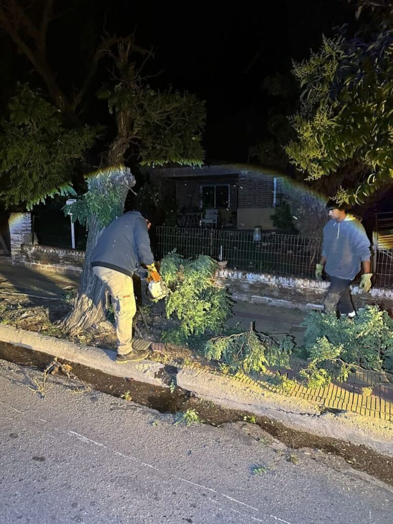 Durante la madrugada del sábado, distintas áreas de la Secretaría de Servicios Públicos trabajaron en la remoción de árboles y ramas caídas, además del despeje de calles y sectores donde el material vegetal impedía el tránsito. En uno de los procedimientos intervino también Bomberos Voluntarios, debido al riesgo que representaba un ejemplar de gran tamaño.