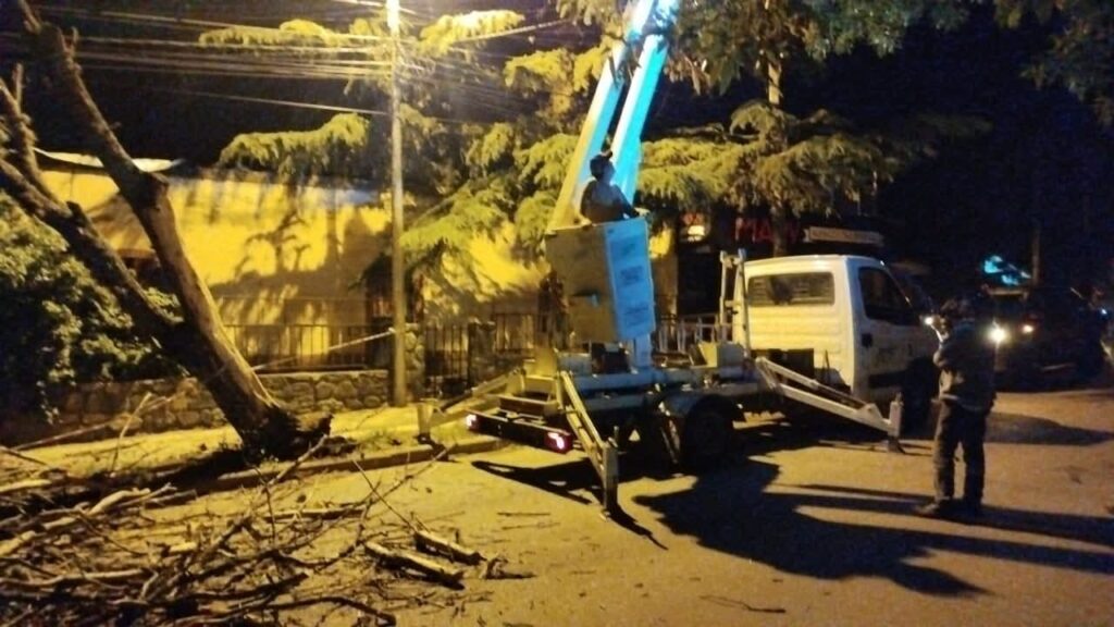 Según se informó, la tormenta se inició el viernes por la tarde y se intensificó durante la noche, con ráfagas de viento que derribaron árboles de gran porte y generaron daños en el tendido eléctrico. Uno de los casos más relevantes ocurrió en calle Baigorria, entre Neptuno y Cerro La Mestila, donde la caída de un árbol provocó un apagón en un amplio sector barrial.