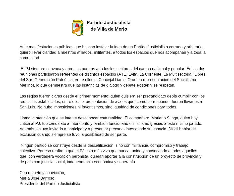 Un comunicado del Partido Justicialista local —firmado por su presidenta, María José Barroso— buscó despejar acusaciones de arbitrariedad, mientras que el dirigente Mariano Stinga redobló críticas en redes sociales contra las alianzas provinciales y la selección de candidaturas. En el centro de la escena, la puja por los lugares en las listas y el control del armado político.