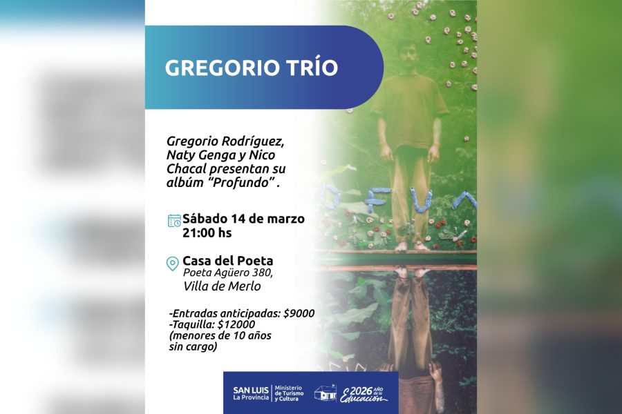 Este sábado 14 de marzo, a las 21:00, la agrupación folclórica local Gregorio Trío ofrecerá un show en vivo en la Casa del Poeta Antonio Esteban Agüero de la Villa de Merlo, donde presentará su álbum “Profundo”. La propuesta invita a disfrutar de una noche musical con sonidos que combinan raíces folclóricas y matices contemporáneos.