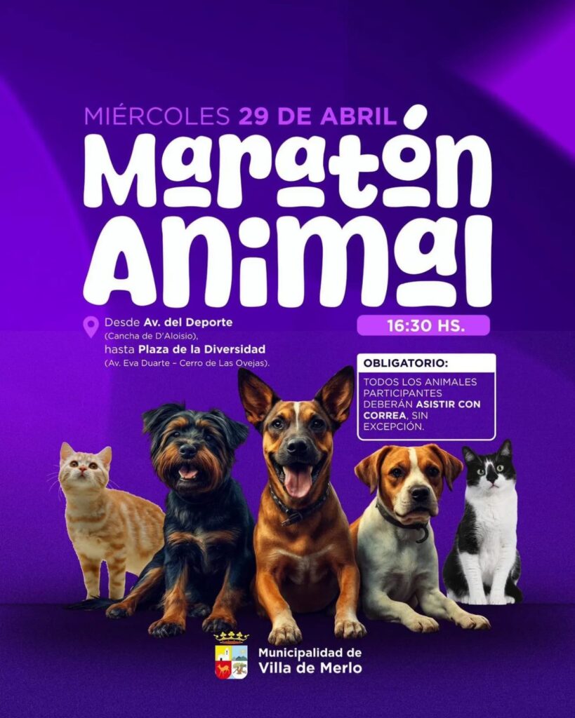 La Municipalidad de la Villa de Merlo invita a vecinos y vecinas a participar de la Maratón Animal 2026, una propuesta que busca fortalecer el compromiso comunitario con el cuidado de los animales de compañía y seguir promoviendo la concientización y la responsabilidad social.