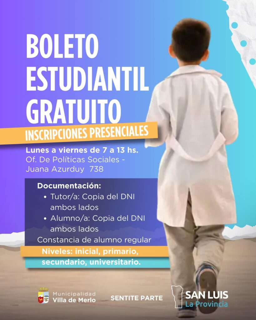 La Municipalidad de la Villa de Merlo informó que ya se encuentra habilitado el trámite para obtener el Boleto Estudiantil Gratuito, un beneficio destinado a estudiantes de nivel inicial, primario, secundario y universitario.